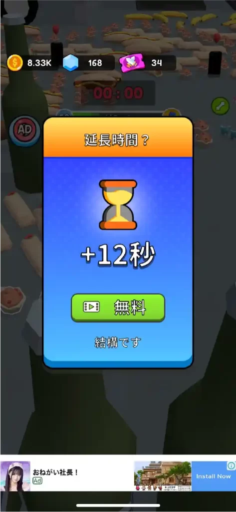 制限時間が終わると広告を見て、延長するかどうかを聞かれますが基本はしないでOKです。