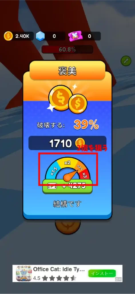 逆に、ステージ1~13はボス戦後の報酬は動画を見て3倍にすることをお勧めします。 (目押しで3倍にすることができます。)
