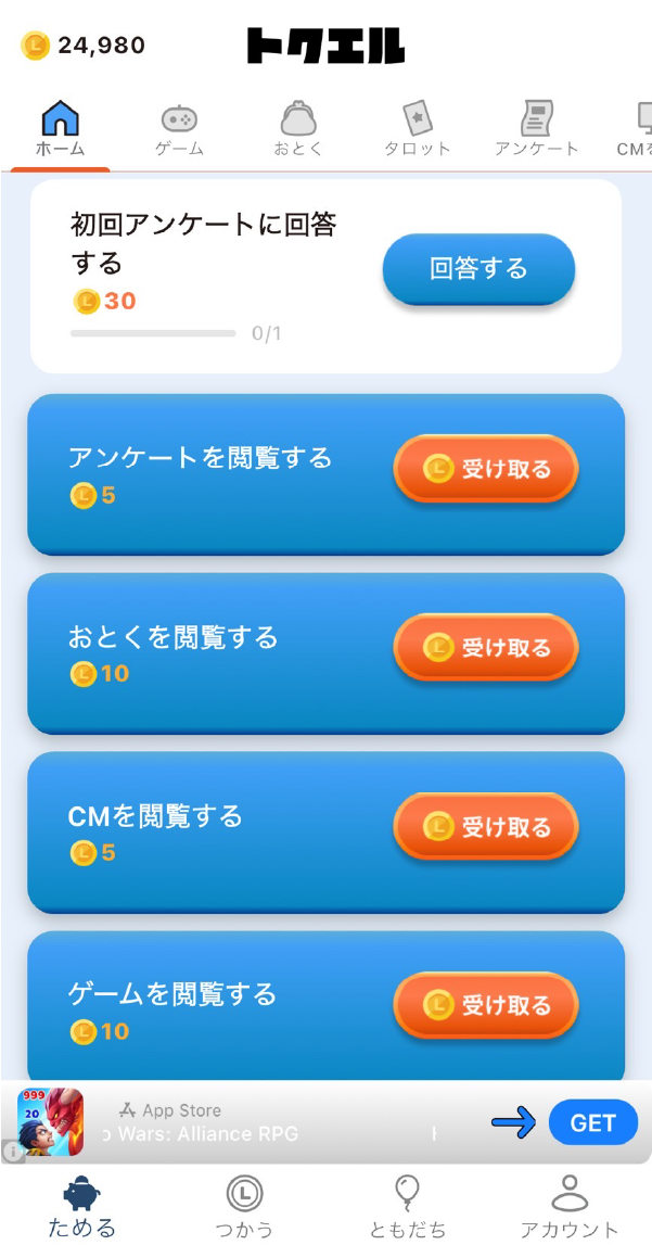 タロットの結果に応じたポイントが受け取れます。1日5回までタロットを引くことができます。