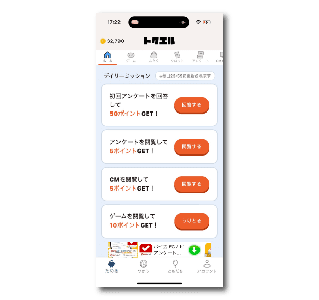 トクエルには、デイリーミッションという機能があります。他アプリでも結構見かける機能ですが、トクエルはかなり量が多くポイントをためやすいです。また、難易度がそこまで高くないので手軽にこなすことができるのもおすすめポイントです。